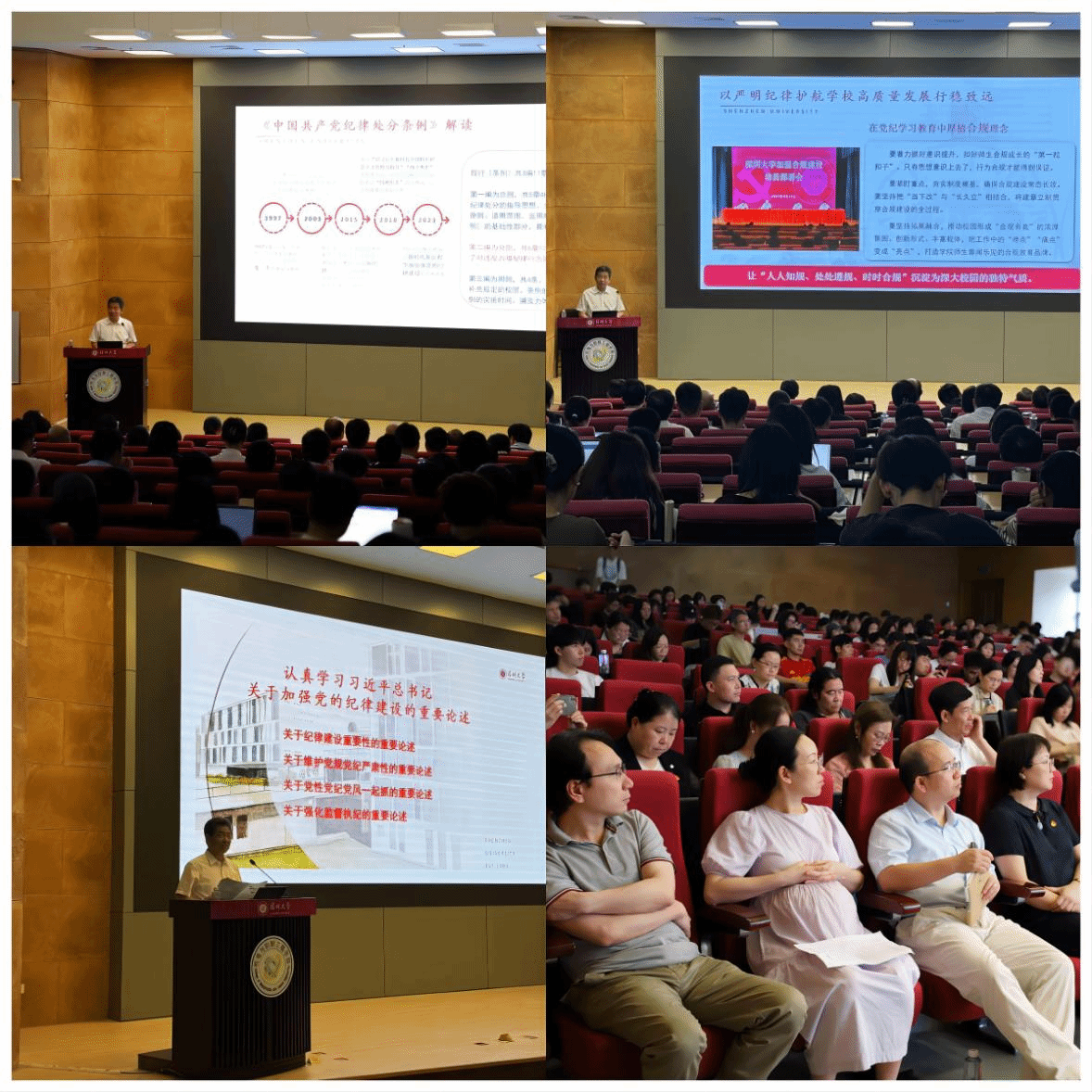 王月兴从党纪的历史沿革、《中国共产党纪律处分条例》的主要内容以及如何开展好党纪学习教育等方面出发,深入解读和阐释了加强党的纪律建设的重要意义和具体要求。讲座中,他聚焦《条例》的具体内容,结合自身纪检监察和反腐倡廉工作经验,对一些典型案例进行深入剖析,告诫师生要把纪律建设和合规建设摆在更突出的位置,不断增强自身政治定力、纪律定力、道德定力、抵腐定力,做一名忠诚干净担当的“深大人”。